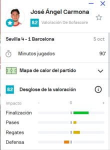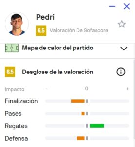 Ahora, con ver ese gráfico, puedes comprobar fácilmente la razón de que un jugador haya tenido una nota más alta o más baja. Si las barras son de color verde o azul en cada categorÃa, significa que el futbolista ha tenido una valoración alta en esos apartados, si por el contrario es naranja o roja, su valoración ha sido baja. Si es amarilla, significa que ha tenido un impacto normal.