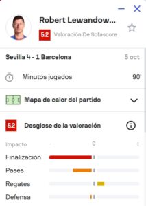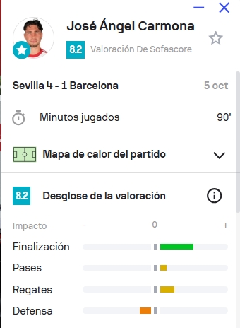 Ahora, con ver ese gráfico, puedes comprobar fácilmente la razón de que un jugador haya tenido una nota más alta o más baja. Si las barras son de color verde o azul en cada categorÃa, significa que el futbolista ha tenido una valoración alta en esos apartados, si por el contrario es naranja o roja, su valoración ha sido baja. Si es amarilla, significa que ha tenido un impacto normal.